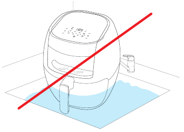 НЕ допускайте свисания шнура с края стола или прилавка, серьезные ожоги могут возникнуть в результате того, что аэрофритюрница будет стянута со стойки, где ее могут схватить дети или она может запутаться в пользователе.- НЕ допускайте касания шнуром питания горячих поверхностей.