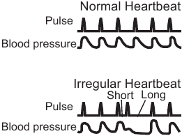 Нерегулярный сердечный ритм определяется как ритм, который на 25% меньше или на 25% больше среднего ритма, обнаруженного во время измерения монитором систолического и диастолического артериального давления.