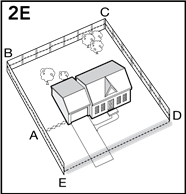 Пример 2 (2E): Периметральная петля с использованием существующего ограждения (одиночная петля) Эта схема позволяет вам включить ваше существующее ограждение в качестве части вашей схемы и не дать вашему питомцу выпрыгнуть или подкопаться под ваше существующее ограждение. Она уменьшает количество провода, который нужно будет закопать. От передатчика ограждения проведите провод к точке A, от A к B, от B к C, от C к D, от D к E, от E к A, скрутите провода от A обратно к передатчику ограждения. См. раздел «Установка граничного провода» для получения дополнительной информации о креплении провода к ограждению.