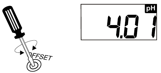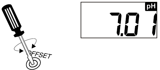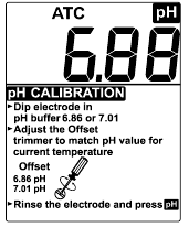 - V 7.01/6.86 pH nastavte trimmer OFFSET v ľavom dolnom rohu predného panela, kým LCD nezobrazí hodnotu pH pri zaznamenanej teplote.