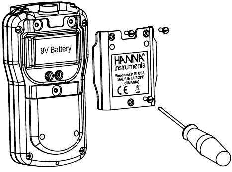 Odskrutkujte tri skrutky na zadnej strane merača, odstráňte kryt priestoru pre batériu a vymeňte 9V batériu za novú, pričom dbajte na správnu polaritu.