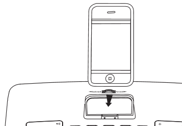 Jemne vložte svoj iPhone alebo iPod do doku (iPhone/iPod nesmie byť v obale). Otáčajte nastavovacím gombíkom doku, kým nebude iPhone/iPod pevne držaný na mieste (príliš ho neuťahujte). iPhone/iPod sa bude počas dokovania nabíjať. Stlačením spustíte prehrávanie svojho iPhone/iPod.