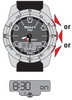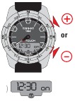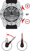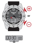 sa ručičky posunú dopredu alebo dozadu. Po úplnej otáčke sa minútová ručička zastaví a hodinová ručička sa posúva/vracia po krokoch po jednej hodine. Čas T2 sa nastavuje v krokoch po 15 minútach.