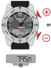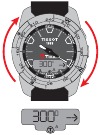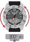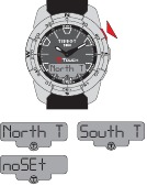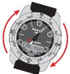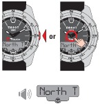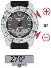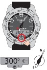 V režime kompasu vám váš T-TOUCH umožňuje definovať a sledovať azimut. Na to stačí nastaviť hodnotu azimutu a zarovnať hodinky pomocou šípok. Os 6-12 hodín bude ukazovať smer, ktorým sa máte vydať.