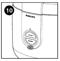 - Varič ryže sa automaticky prepne do režimu udržiavania teploty a rozsvieti sa indikátor udržiavania teploty (Warm (teplé)) (obr. 10).