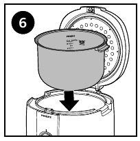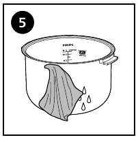 - Utrite vonkajšok vnútornej nádoby do sucha (obr. 5), potom vložte vnútornú nádobu do variča ryže (obr. 6). Skontrolujte, či je vnútorná nádoba v správnom kontakte s vykurovacím telesom.