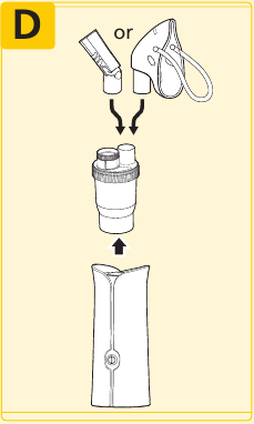 - Pripojte zahnutý náustok alebo masku k súprave nebulizátora.