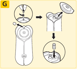 - Znova zostavte súpravu nebulizátora tak, že opatrne otočíte nádobku na lieky a kryt k sebe. Uistite sa, že obe časti bezpečne držia.