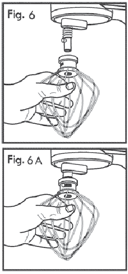 - Zarovnajte otvor v hornej časti šľahača/príslušenstva s kolíkom na hriadeli hlavy mixéra. Zatlačte šľahač/príslušenstvo nahor na hriadeľ a otáčajte proti smeru hodinových ručičiek, kým sa kolík úplne nezasunie do otvoru (pozri obr. 6 a 6A).