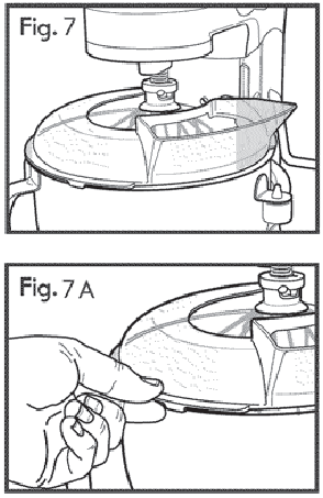 Pripevnite ochranu proti striekaniu po pripevnení misy a šľahača, drôteného šľahača alebo háku. Otvorená časť ochrany proti striekaniu smeruje k mixéru a lievik je vpravo, keď stojíte pred mixérom (obr. 7). Položte ochranu proti striekaniu na okraj misy tak, aby plastové úchytky boli na vonkajšej strane misy (obr. 7A).