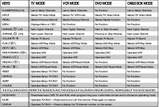 - Ak chcete ovládať každý produkt (VCR, TV, Káblový konvertor ("Cable Converter Box") alebo DVD), musíte najprv naprogramovať diaľkové ovládanie; potom stlačte správne tlačidlo režimu (VCR, TV alebo AUX) na výber prevádzkového režimu. Režimy VCR a TV sú predprogramované s kódmi Sanyo.