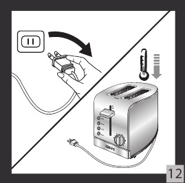 - Ak sa chlieb po opekaní zasekne v štrbinách, jednotka sa automaticky vypne. Okamžite ho odpojte zo zásuvky a pred pokusom o vybratie počkajte, kým hriankovač nevychladne.