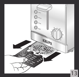 - Ak chcete odstrániť omrvinky zo spotrebiča, jemne ho vysuňte zo spotrebiča a vyprázdnite ho (Obr. 13).