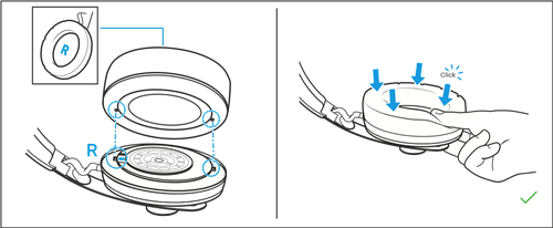- Priraďte náušníky na pravú a ľavú stranu. Šev náušníka musí smerovať nadol.