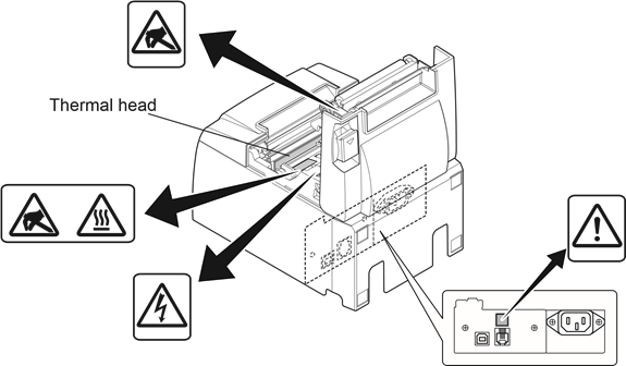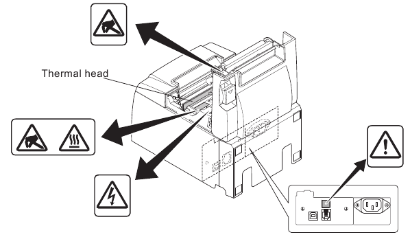 Tieto štítky sa nachádzajú v blízkosti tepelnej tlačovej hlavy. Pretože je tepelná tlačová hlava horúca ihneď po tlači, nedotýkajte sa jej. Statická elektrina môže poškodiť tepelnú tlačovú hlavu. Aby ste chránili tepelnú tlačovú hlavu pred statickou elektrinou, nedotýkajte sa jej.