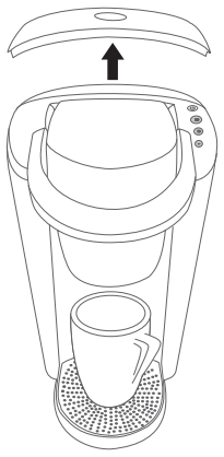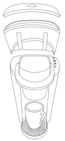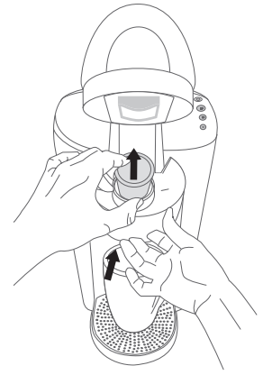 Če želite odstraniti držalo za kapsule K-Cup® iz kavnega aparata, dvignite ročico in z eno roko primite zgornji del držala za kapsule K-Cup®, medtem ko z drugo roko potiskate dno držala za kapsule K-Cup® od spodaj navzgor, dokler se ne sprosti. Po čiščenju poravnajte držalo za kapsule K-Cup® z odprtino, pri čemer uporabite dve sprednji rebrci kot vodilo, in ga zaskočite na svoje mesto od zgoraj.