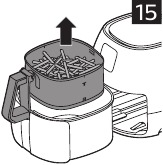 - Če želite odstraniti majhne sestavine (npr. krompirček), dvignite košaro iz posode za ročaj (slika 15).