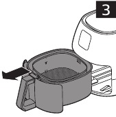 - Nekatere sestavine je treba med postopkom kuhanja pretresti. Če želite pretresti sestavine, odprite predal tako, da povlečete ročaj (slika 3). Odstranite košaro tako, da dvignete ročaj (1) (slika 4), nato jo pretresite. Vstavite košaro nazaj v posodo in potisnite predal nazaj v cvrtnik na vroč zrak.