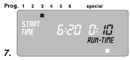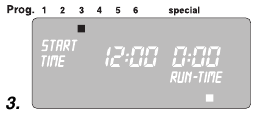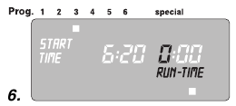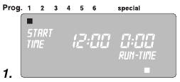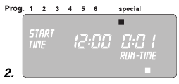 Predprogramiranje upošteva 30-minutni premor, ki je potreben med programi, kot tudi minimalni čas zalivanja 30 sekund (prikaz: 1 min.).