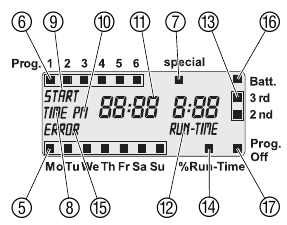 | 11 | Time/Start time) (Čas/Čas začetka) | Trenutni čas / Čas začetka zalivanja (zaslon 13 h = 1 pm; npr. v ZDA, Kanadi). |