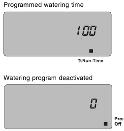 Če so programi zalivanja izklopljeni, potem ko ste potrdili posebno funkcijo (indikator stanja na Off Prog. (Izklop programa)), se vsi programi, ki se začnejo v tem času, skrajšajo na minimalni čas zalivanja 30 sekund (prikaz: 1 min.). To zagotavlja, da se ohrani vrstni red programov zalivanja do ustreznega izhoda samodejnega razdelilnika vode.