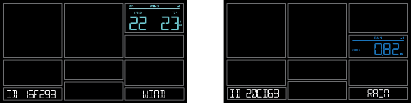 | Senzor za dež LTV-R2: | Sprememba padavin za 0,2 mm (0,008 palca) - 3 minute, če ni spremembe Preverja dež vsakih 45 sekund |