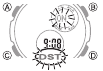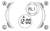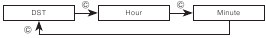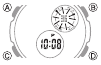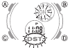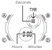 - Ponastavitev samo sekund (brez spreminjanja ure, minute ali nastavitve DST) povzroči samodejno prilagoditev analognega minutnega kazalca. Če spremenite uro, minuto ali nastavitev DST, morate uporabiti tudi postopek pod "Za nastavitev analognega časa", da ustrezno prilagodite analogne kazalce.