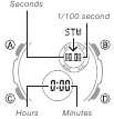 hkrati. To zaklene hitro premikanje kazalcev, tako da lahko spustite oba gumba. Hitro premikanje kazalcev se nadaljuje, dokler ne pritisnete katerega koli gumba. Samodejno se bo ustavilo tudi po 12 urah ali če se začne alarm (dnevni alarm, Hourly Time Signal ali odštevalni alarm).