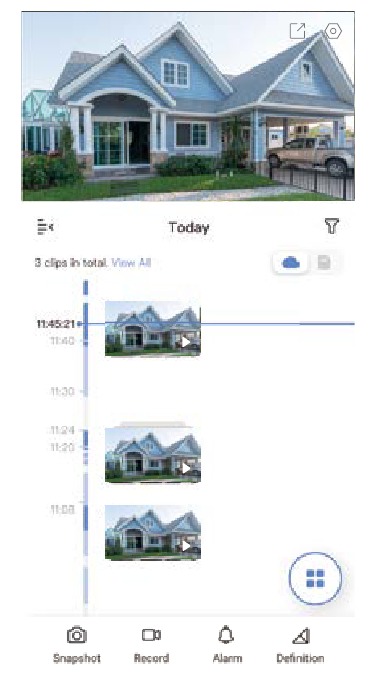 Zaženite aplikacijo EZVIZ, tapnite Live View (pogled v živo), kjer si lahko ogledate in poslušate prenos v živo, posnamete posnetke, snemate videoposnetke in po potrebi izberete definicijo videa.