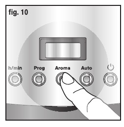 Opomba: Lahko pritisnete gumb ARO MA (m), če želite pripraviti močnejšo kavo (glejte 5- IZBIRA AROME) - Pritisnite gumb AUTO (l). Njegova LED dioda bo zasvetila, kar pomeni, da je kavni aparat programiran. V spodnjem desnem kotu LC D se prikaže ikona ure. Digitalna ura bo še naprej prikazovala trenutni čas.