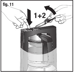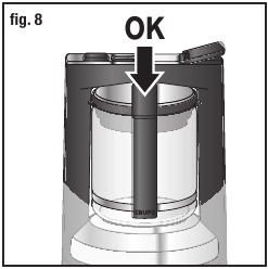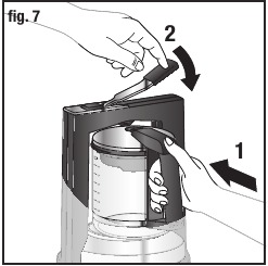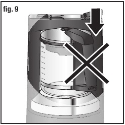 - Steklena karafa (E) mora biti nameščena tako, da je ročaj natančno na sredini aparata in ne obrnjen na stran. Slika 8 in 9