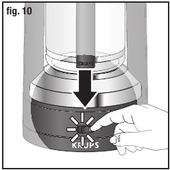 NB: Upoštevajte, da je normalno, da mine nekaj časa med začetkom cikla priprave kave in trenutkom, ko kava začne kapljati v karafo. To ustreza času, ki je potreben za povečanje pritiska v aparatu. Prav tako bo prišlo do majhne izgube količine vode med tem, kar je bilo sprva vlito, in tem, kar je v karafi po ciklu priprave kave.