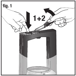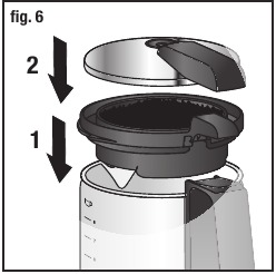 - Postavite pokrov (C) na trajni filter (D) in to enoto postavite nazaj na stekleno karafo (E).