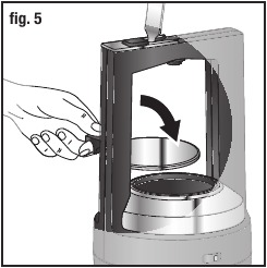- Postavite pokrov (F) na posodo za vodo (G) tako, da je ročaj obrnjen nazaj. Slika 5