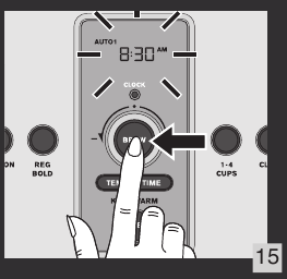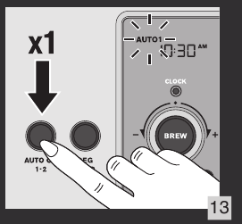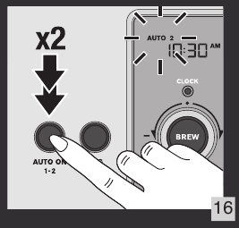 - Izberite AUTO 1 ali AUTO 2 s pritiskom na gumb AUTO ON (samodejni vklop). Pritisnite gumb BREW/control (k) za zagon programa samodejnega vklopa.