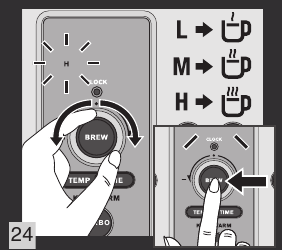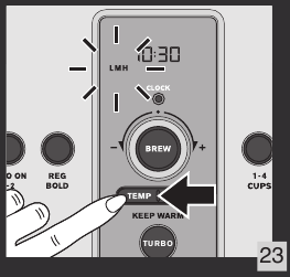 - Pritisnite gumb TEMP (temperatura) (t) in obrnite gumb BREW/control (k) za izbiro stopnje temperature. Slika 23 in 24.