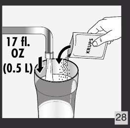 - Uporabite raztopino za odstranjevanje vodnega kamna KRUPS® ali 5 fl. oz belega kisa, razredčenega v 17 fl.oz hladne vode ali vode sobne temperature, ali 1,5 oz citronske kisline, razredčene v 17 fl. oz, dokler se kristali popolnoma ne raztopijo. Slika 28.