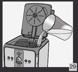 - Vlijte raztopino v rezervoar za vodo (brez kave). Slika 29.