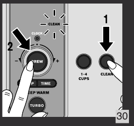- Pritisnite gumb CLEAN (čiščenje) (o) in nato gumb BREW (kuhanje)/kontrolni gumb (k), da zaženete cikel odstranjevanja vodnega kamna. Slika 30.