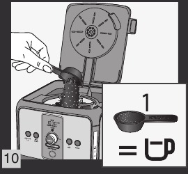 - Dodajte 1 žlico KRUPS (v) mlete kave na skodelico. Ne prekoračite 12 žlic (2 unci). Slika 10.