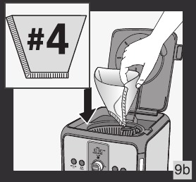 - Prepričajte se, da je držalo filtra (i) vstavljeno. Slika 8. Postavite trajni filter (j) v držalo filtra (i) Slika 9a ali papirni filter št. 4 Slika 9b. Če uporabljate papirni filter, se prepričajte, da je popolnoma odprt in pravilno nameščen v držalu filtra.