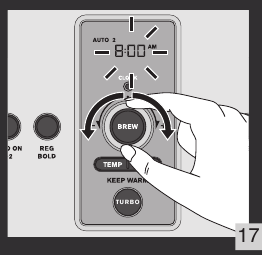- Obrnite gumb BREW/control (k) za nastavitev časa. Potrdite s pritiskom na gumb BREW/control (k). Prikaže se čas. Slika 17 in 18.