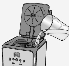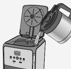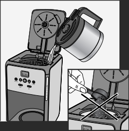 - Priporočamo, da odstranite držalo filtra s filtrom, preden dodate mleto kavo. Če pomotoma vlijete mleto kavo v posodo za vodo, ne zaženite cikla. Očistite posodo, sicer lahko kava zamaši vodni krog.