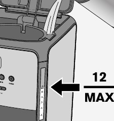 - Napolnite termo posodo (g) s hladno ali toplo vodo in zaprite pokrov tako, da puščico poravnate z besedo 'OPEN' (ODPRI), nato pa pokrov zavrtite, da se puščica poravna z besedo 'CLOSE' (ZAPRI). Vlijte vodo v rezervoar za vodo s pritiskom na ročico na pokrovu termo posode, da voda začne teči. Število skodelic je prikazano z indikatorjem nivoja vode. Ne prekoračite 12 skodelic.