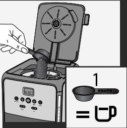 - Dodajte 1 KRUPS žlico (v) mlete kave na skodelico. Ne prekoračite 12 žlic (2 unci).