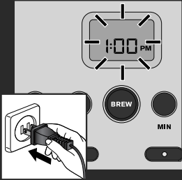 - Ko prvič priključite aparat za kavo, bo na zaslonu začelo utripati "1:00 pm". Nastavite čas s pritiskom na gumb H (n) za nastavitev ure in gumb MIN (o) za nastavitev minut. Čas se bo prikazal na zaslonu. Samodejno se bo nastavil po 5 sekundah ali s pritiskom na gumb BREW (l).