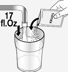 - Uporabite raztopino za odstranjevanje vodnega kamna KRUPS® ali 500 ml belega kisa, razredčenega v 500 ml hladne vode ali vode sobne temperature, ali 40 g citronske kisline, razredčene v 500 ml, dokler se kristali popolnoma ne raztopijo.