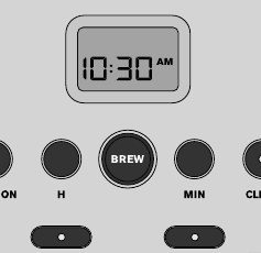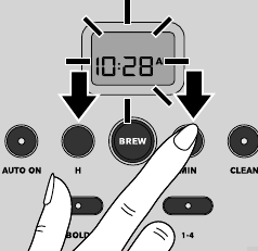 - Čas lahko nastavite ali spremenite tudi kadar koli drugič. Nastavite čas s pritiskom na gumb H (n) za nastavitev ure in gumb MIN (o) za nastavitev minut. Čas se bo prikazal na zaslonu. Samodejno se bo nastavil po 5 sekundah ali s pritiskom na gumb BREW.