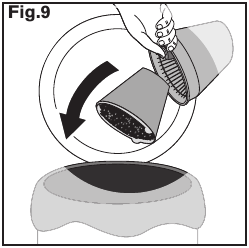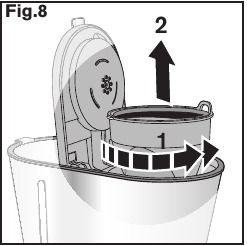 - Za odstranitev uporabljene kave odstranite držalo filtra iz aparata za kavo, sliki 8 in 9.