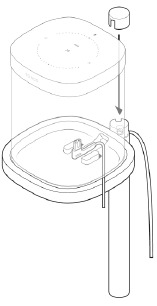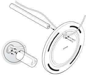 - Napeljite napajalni kabel zvočnika skozi odprtino na nosilcu in ga priključite v zvočnik. Postavite ga na nosilec.